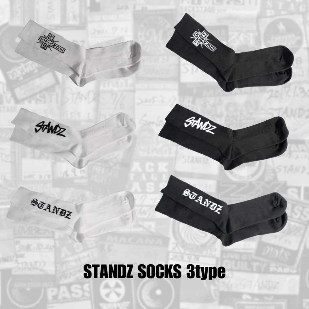 STANDZ OPEN COLLAR SHIRT color : Black 8月1日〜10日まで受注販売 BUY NOW STANDZ SNAP BACK color : Navy BUY NOW STANDZ FACE TOWEL BUY NOW STDZ BACKET HAT color :Black BUY NOW GI BELT color : オフホワイト、ブラック BUY NOW STANDZ SOCKS 3 types color : White , Black BUY NOW オンラインショップはこちらから STANDZ オフィシャルグッズストア STANDZ OFFICIAL ONLINE STORE powered by BASESTANDZ オフィシャルグッズストア